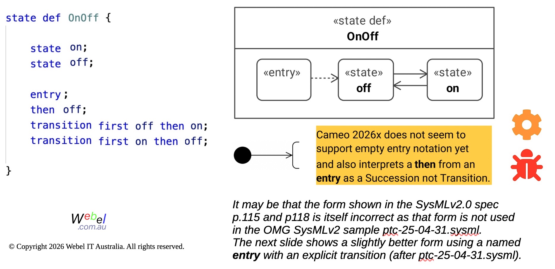 Cameo 2026x SysMLv2 does not seem to support empty entry notation yet and also interprets a then from an entry as a Succession not Transition.
