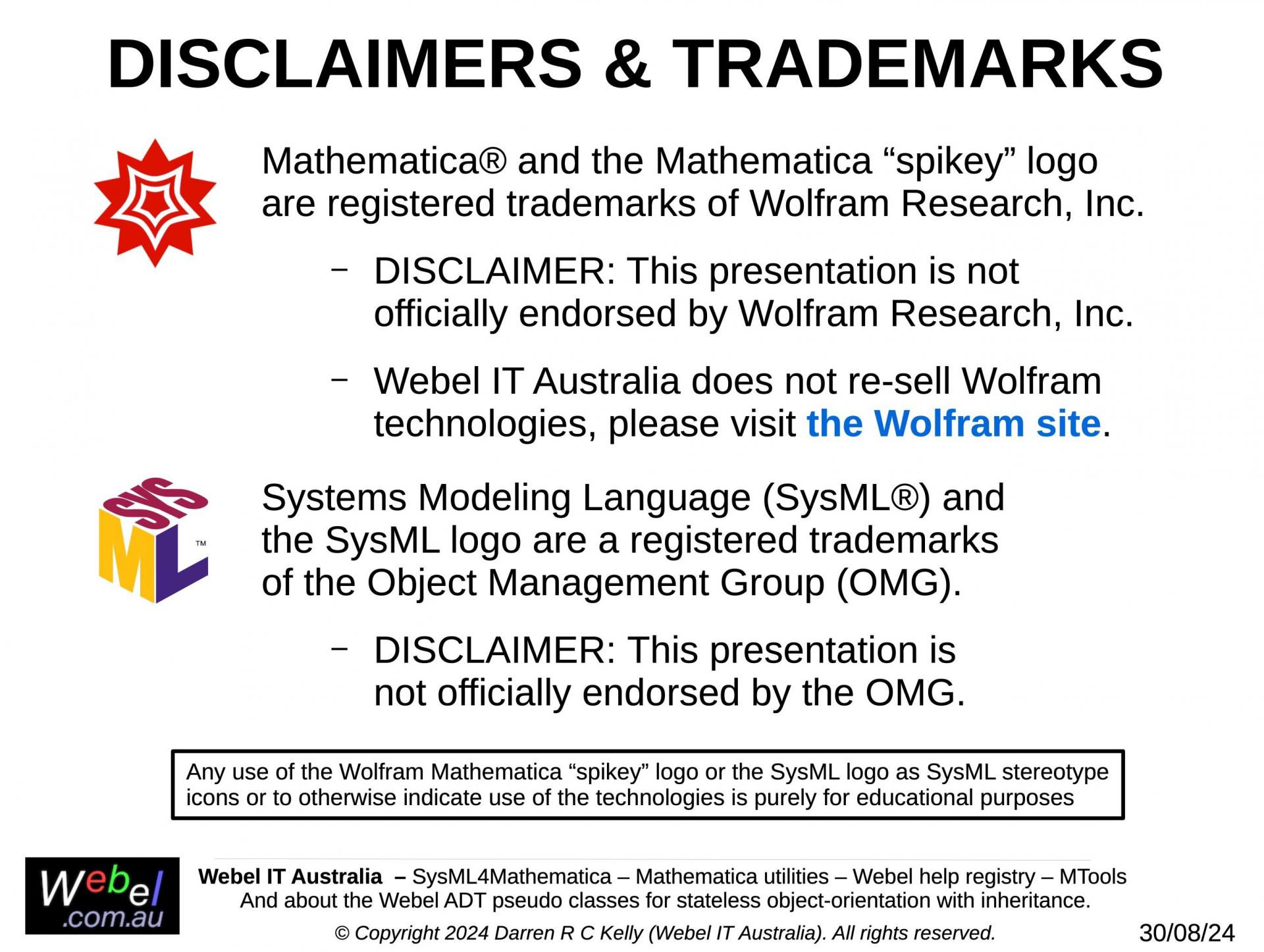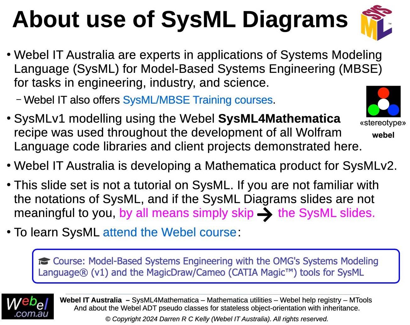 DISCLAIMER: Webel IT Australia does not represent No Magic or Dassault Systèmes - the developers of the MagicDraw® UML (aka Magic Software Architect), MagicDraw SysML Plugin, Magic Cyber-Systems Engineer ® (Cameo Systems Modeler®), and Magic Model Analyst® (Cameo Simulation Toolkit®) tools. Webel IT Australia offers IT Training Courses in UML® and SysML® and in expert use of these supporting tools. Please refer sales and technical support questions to No Magic.